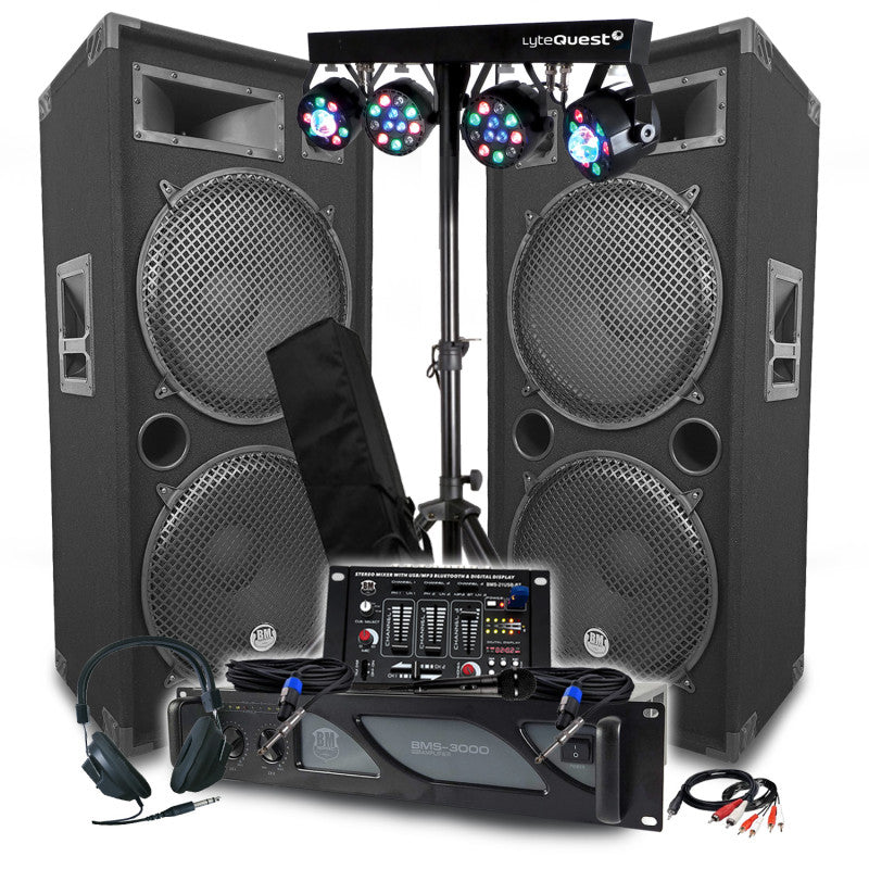 BM SONIC – Výkonná audio súprava 3000 W s LSC215 reproduktormi 2×2000 W, mixážnym pultom, Bluetooth, a portikom so 8 LED svetlami